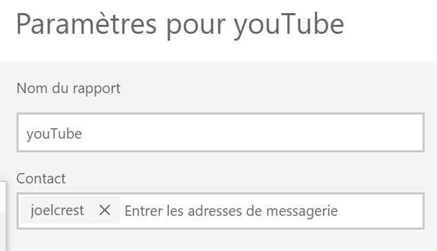 Le propriétaire du rapport fait, par défaut, partie de cette liste. On peut lui ajouter une ou plusieurs autres adresses e-mail (adresses individuelles, groupes Office 365, groupes de diffusion ou groupe de sécurité disposant d’une adresse).